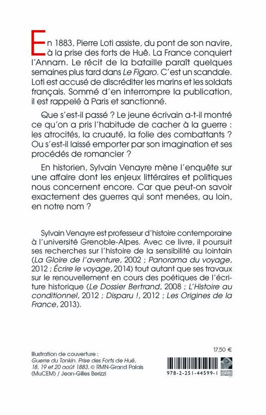 En 1883, Pierre Loti assiste, du pont de son navire, a la prise des forts de Hue. La France conquiert l'Annam. Le recit de la bataille parait quelques semaines plus tard dans Le Figaro. C'est un scandale. Loti est accuse de discrediter les marins et les soldats francais. Somme d'en interrompre la publication, il est rappele a Paris et sanctionne. Que s'est-il passe ? Le jeune ecrivain a-t-il montre ce qu'on a pris l'habitude de cacher a la guerre: les atrocites, la cruaute, la folie des combattants ? Ou s'est-il laisse emporter par son imagination et ses procedes de romancier ? En historien, Sylvain Venayre mene l'enquete sur une affaire dont les enjeux litteraires et politiques nous concernent encore. Car que peut-on savoir exactement des guerres qui sont menees, au loin, en notre nom