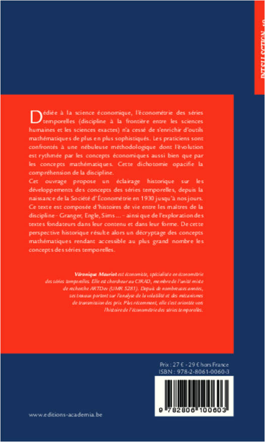 Adoptant la perspective historique, cet ouvrage relate les développements des concepts des séries temporelles, depuis la naissance de la Société d'Économétrie en 1930 jusqu'à nos jours. Il est construit à partir d'histoires de vie entre les maîtres de la discipline et explore les textes fondateurs dans leur contenu et dans leur forme. Guidé par l'analyse de la démarche intellectuelle des grands économètres, l'économiste parvient ainsi à s'approprier les concepts des séries temporelles.