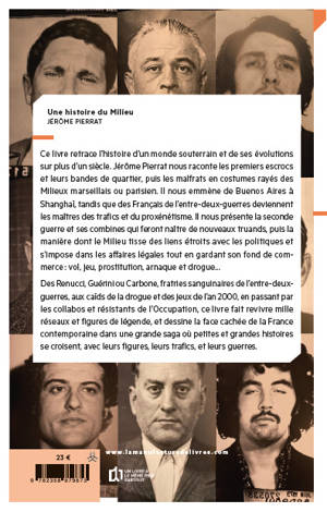 Ce livre retrace l’histoire d’un monde souterrain et de ses évolutions au fil du siècle. Jérôme Pierrat nous raconte les premiers escrocs et leurs bandes de quartier puis les malfrats en costumes rayés du Milieu marseillais ou parisien. Il nous emmène de Buenos Aires à Shanghaï, tandis que des Français de l’entre-deux guerre deviennent les maîtres des trafics et du proxénétisme. Il nous raconte la seconde guerre et ses combines qui feront naître de nouveaux truands. Puis la manière dont le Milieu tisse des liens étroits avec les politiques et s’impose dans les affaires légales tout en gardant leur fond de commerce, vol, jeu, prostitution, arnaque et drogue…