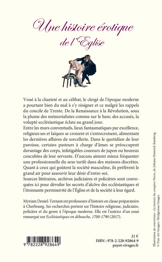 Voué à la chasteté et au célibat, le clergé de l'époque moderne a pourtant bien du mal à s'y résigner et ce malgré les rappels du concile de Trente. De la Renaissance à la Révolution, sous la plume des mémorialistes comme sur le banc des accusés, la volupté ecclésiastique éclate au grand jour. Entre les murs conventuels, lieux fantasmatiques par excellence, religieux.ses et laïques se croisent et s'entrecroisent, alimentant les dernières affaires de sorcellerie. Dans le quotidien de leur paroisse, certains pasteurs à charge d'âmes se préoccupent davantage des corps, infatigables coureurs de jupon ou heureux concubins de leur servante. D'aucuns aiment mieux fréquenter une professionnelle du sexe tarifé dans des maisons discrètes. Quant à ceux qui goûtent la société masculine, ils préfèrent le grand air pour assouvir leur désir d'entre-soi. Sources littéraires, archives judiciaires et policières sont convoquées ici pour dévoiler les secrets d'alcôve des ecclésiastiques et l'étonnante permissivité de l'Église et de la société à leur égard.