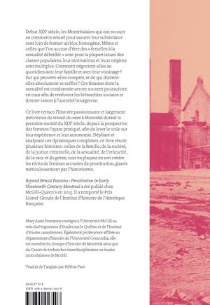 Début XIXe siècle, les Montréalaises qui ont recours au commerce sexuel pour assurer leur subsistance sont loin de former un bloc homogène. Même si celles que l'on accuse d'être des « femelles à la sexualité débridée » sont pour la plupart issues des classes populaires, leurs motivations et leurs origines sont multiples. Comment négocient-elles au quotidien avec leur famille et avec leur voisinage? Sur qui peuvent-elles compter, et de qui doivent-elles absolument se méfier? Ces femmes dont la sexualité est condamnée seront souvent poursuivies en cour afin de renforcer les hiérarchies sociales et donner raison à l'autorité bourgeoise. Ce livre retrace l'histoire passionnante et largement méconnue du travail du sexe à Montréal durant la première moitié du XIXe siècle, depuis la perspective des femmes l'ayant pratiqué, afin de lever le voile sur leur expérience et leur autonomie.