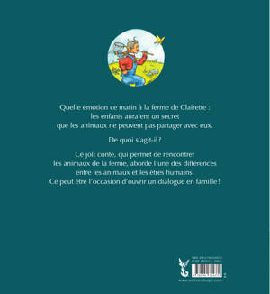 Tous les enfants du monde auraient un secret qu’aucun animal ne pourra jamais partager avec eux. Cette déclaration suscite bien des remous dans la ferme de Clairette ! Le chat Griffon mène l’enquête. Il se renseigne auprès du chien Prince, du coq Victor, du cochon Dodu, de l’âne Grison, de la tortue Lambinette, en vain. Ne serait-ce pas l’agneau Blance-Laine qui détient la réponse ? Effectivement, l’agneau préféré de Clairette connaît la différence entre les enfants et les animaux. Un joli conte pour faire réfléchir les enfants et pour rencontrer les animaux de la ferme.