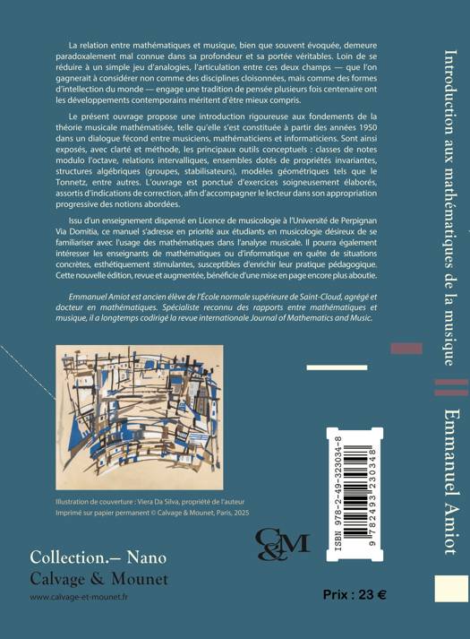 Les rapports entre mathématiques et musique remontent au moins à Pythagore. Le but du présent ouvrage n'est pas d'explorer leurs développements les plus récents et les plus vertigineux, mais, au contraire, de présenter les notions les plus abordables, socle commun des spécialistes mais peu souvent rassemblées dans un même texte en français. Le contenu a été élaboré et testé pour le public de la licence de musicologie de l'Université de Perpignan, lequel n'était pas tenu de posséder la moindre culture mathématique. L'objectif est de proposer un bagage minimal permettant de comprendre quelque chose à ce qui se fait actuellement dans le domaine, voire d'aborder la lecture d'articles de recherche ou création contemporaine avec le confort de connaître les concepts requis : une culture humaniste et les bases pour aller plus loin. L'auteur a l'ambition de dépasser les nombreuses ressources de vulgarisation existantes, en veillant à préserver précieusement la généralité et la structure des vraies définitions mathématiques.