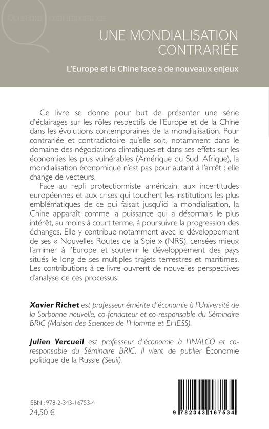 Ce livre se donne pour but d'éclairer les rôles respectifs de l'Europe et de la Chine dans les évolutions contemporaines de la mondialisation. Pour contrariée et contradictoire qu'elle soit, la mondialisation économique n'est pas pour autant à l'arrêt : elle change de vecteurs. Face au repli protectionniste américain, aux incertitudes européennes et aux crises qui touchent les institutions les plus emblématiques de ce qui faisait jusqu'ici la mondialisation, la Chine apparaît comme la puissance qui a désormais le plus intérêt à poursuivre la progression des échanges. Elle y contribue notamment avec le développement de ses "Nouvelles Routes de la Soie" (NRS). Les contributions à ce livre ouvrent de nouvelles perspectives.