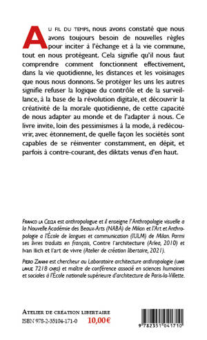 Au fil du temps, nous avons constaté que nous avons toujours besoin de nouvelles règles pour inciter à l’échange et à la vie commune, tout en nous protégeant. Cela signifie qu’il nous faut comprendre comment fonctionnent effectivement, dans la vie quotidienne, les distances et les voisinages que nous nous donnons. Se protéger les uns les autres signifie refuser la logique du contrôle et de la surveillance, à la base de la révolution digitale, et découvrir la créativité de la morale quotidienne, de cette capacité de nous adapter au monde et de l’adapter à nous. Ce livre invite, loin des pessimismes à la mode, à redécouvrir, avec étonnement, de quelle façon les sociétés sont capables de se réinventer constamment, en dépit, et parfois à contre-courant, des diktats venus d’en haut.