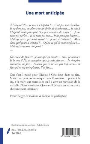 À l’hôpital !!!… Je suis à l’hôpital !… C’est pas ma chambre. Je ne dors pas, ou alors c’est un drôle de cauchemar… Je suis à l’hôpital, mais pourquoi ? Ça fait combien de temps ?… Je ne peux pas parler… Je ne peux pas voir… Je ne peux pas bouger… Mais qu’est-ce qui m’est arrivé ?… Je suis à l’hôpital… Mais dans quel genre d’hôpital ?… Qu’est-ce qu’ils vont me faire ?… Mais qu’est-ce qui s’est passé ? … J’ai envie de pleurer. Je sens que ça monte… Oui, ça monte ! Je le sens !! J’ai la sensation que je vais pleurer… Je récupère vraiment, en fait… Pourvu que ce ne soit pas trop tard… Il faut qu’on me voie pleurer. Il le faut… Que s’est-il passé pour Nicolas ? Cela bout dans sa tête. Mais il ne peut communiquer avec l’extérieur. Il pense à la vie, à la mort, aux siens, à ce qu’il a écrit en prévision de la maladie. Nous le suivons. Que va-t-il devenir au terme de ce cheminement intérieur ?