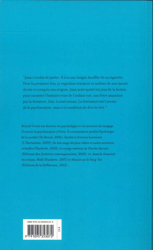 "Juan s'arrêta de parler. Il tira une longue bouffée de sa cigarette. Pour la première fois, je regardais vraiment la raideur de son épaule droite et compris son origine. Juan avait quitté les jeux de la fiction pour raconter l'histoire vraie de l'enfant ciel, son frère assassiné par la dictature. Oui, il avait raison. La littérature est l'avenir de la psychanalyse mais à condition de dire le réel."