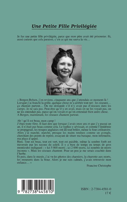 Les souvenirs d'une enfant qui connaîtra les camps de Drancy, Pithiviers, Beaune-la-Rolande avant d'arriver à Bergen-Belsen avec sa mère, comme toutes les femmes et tous les enfants de prisonniers de guerre français.