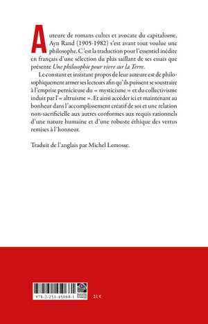 Auteure de romans cultes et avocate du capitalisme, Ayn Rand (1905-1982) s'est avant tout voulue une philosophe. C'est la traduction pour l'essentiel inedite en francais d'une selection du plus saillant de ses essais que presente Une philosophie pour vivre sur la Terre. Le constant et insistant propos de leur auteure est de philosophiquement armer ses lecteurs afin qu'ils puissent se soustraire a l'emprise pernicieuse du mysticisme et du collectivisme induit par l' altruisme . Et ainsi acceder ici et maintenant au bonheur dans l'accomplissement creatif de soi et une relation non-sacrificielle aux autres conformes aux requis rationnels d'une nature humaine et d'une robuste ethique des vertus remises a l'honneur.