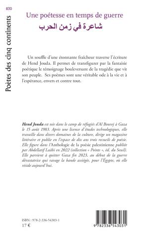 Un souffle d’une étonnante fraîcheur traverse l’écriture de Hend Jouda. Il permet de transfigurer par la fantaisie poétique le témoignage bouleversant de la tragédie que vit son peuple. Ses poèmes sont une véritable ode à la vie et à l’espérance, envers et contre tout.