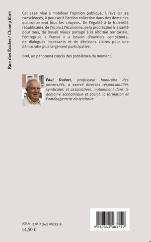 Cet essai vise à mobiliser l'opinion publique, à réveiller les consciences, à pousser à l'action collective dans des domaines qui concernent tous les citoyens. De l'égalité à la fraternité républicaine, de l'école à l'économie, de la procréation à la santé pour tous, du travail mieux partagé à la réforme territoriale, l'entreprise « France » a besoin d'ouvriers compétents, de dialogues incessants et de décisions claires pour une démocratie plus largement participative. Voici un panorama concis des problèmes du moment.