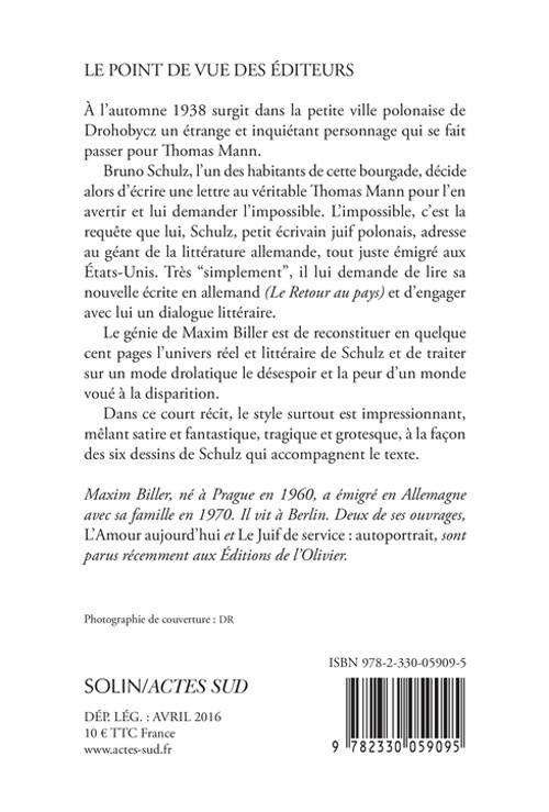 Bruno Schulz, l'un des habitants de cette bourgade, décide alors d'écrire une lettre au véritable Thomas Mann pour l'en avertir et lui demander l'impossible. L'impossible, c'est la requête que lui, Schulz, petit écrivain juif polonais, adresse au géant de la littérature allemande, tout juste émigré aux États-Unis. Très "simplement", il lui demande de lire sa nouvelle écrite en allemand («Le Retour au pays») et d'engager avec lui un dialogue littéraire.