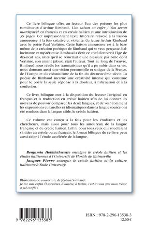 Ce livre bilingue offre au lecteur l'un des poèmes les plus tumultueux d'Arthur Rimbaud, Une saison en enfer, en français et en créole haïtien, et une introduction de 35 pages. Cet impressionnant texte littéraire renvoie à la liaison amoureuse, à la fois créative et violente, du jeune Arthur Rimbaud avec le poète Paul Verlaine.
