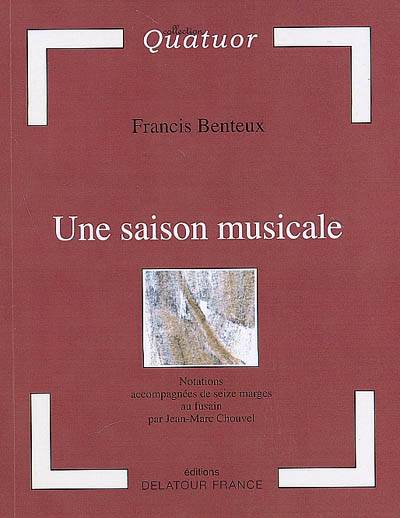 À laquelle, sur le même mode de l'esquisse, Jean-Marc Chouvel a choisi de réagir par le dessin, Une saison musicale réunit des notations sur les lieux, les compositeurs et interprètes, ou bien encore le public d'une série de concerts auxquels Francis Benteux assista dans les années 1990.