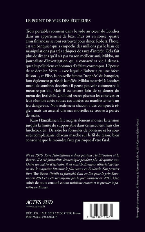 Trois portables sonnent dans le vide au coeur de Londres dans un appartement de luxe. Plus tôt en soirée, quatre amis finlandais se sont retrouvés pour dîner. Robert, l'hôte, est un banquier qui a empoché des millions par le biais de manipulations pas très éthiques de taux d'intérêt. Cela fait plus de dix ans qu'il n'a pas vu son meilleur ami, Mikko, un journaliste d'investigation qui a consacré sa vie à démasquer les politiciens et hommes d'affaires corrompus. L'épouse de ce dernier, Veera - avec laquelle Robert a eu une brève liaison -, et Elise, la nouvelle femme "trophée" du banquier, font également partie de la mêlée. Mikko est arrivé à Londres muni de sombres desseins : il pense pouvoir commettre le meurtre parfait. Mais il est encore loin de se douter du menu des festivités. Un lourd secret pèse sur les convives, et leur réunion après toutes ces années est manifestement un jeu dangereux. Non seulement chacun a des comptes à régler, mais un arsenal d'armes mortelles se trouve à portée de main. Karo Hämäläinen fait magistralement monter la tension jusqu'à la limite du supportable dans ce succulent huis clos hitchcockien. Derrière les formules de politesse et les sourires complaisants, chacun marche sur le fil du rasoir, bien conscient que le moindre faux pas risque d'être fatal.
