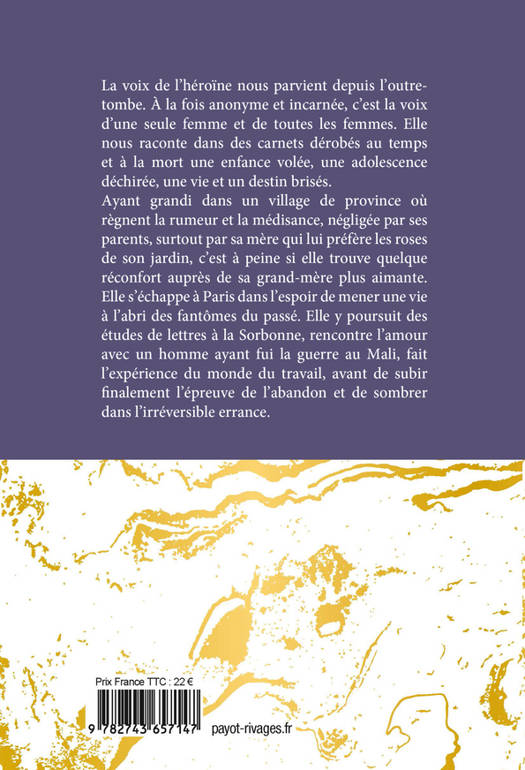 Ayant grandi dans un village de province où règnent la rumeur et la médisance, négligée par ses parents, surtout par sa mère qui lui préfère les roses de son jardin, c'est à peine si elle trouve quelque réconfort auprès de sa grand-mère plus aimante. Elle s'échappe à Paris dans l'espoir de mener une vie à l'abri des fantômes du passé. Elle y poursuit des études de lettres à la Sorbonne, rencontre l'amour avec un homme ayant fui la guerre au Mali, fait l'expérience du monde du travail, avant de subir finalement l'épreuve de l'abandon et de sombrer dans l'irréversible errance.