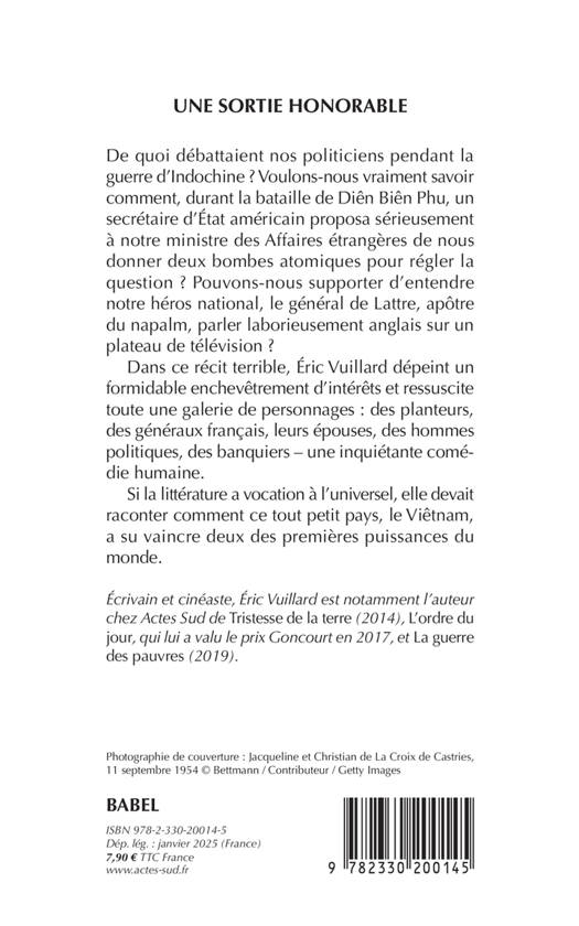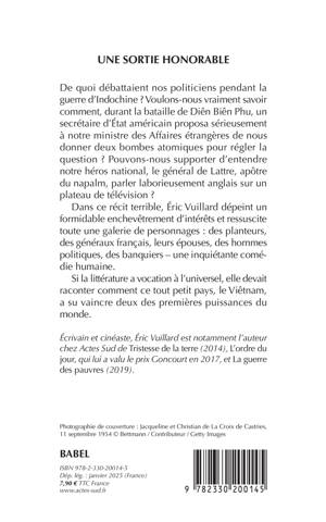 De quoi débattaient nos politiciens pendant la guerre d'Indochine ? Voulons-nous vraiment savoir comment, durant la bataille de Diên Biên Phu, un secrétaire d'État américain proposa sérieusement à notre ministre des Affaires étrangères de nous donner deux bombes atomiques pour régler la question ? Pouvons-nous supporter d'entendre notre héros national, le général de Lattre, apôtre du napalm, parler laborieusement anglais sur un plateau de télévision ? Dans ce récit terrible, Éric Vuillard dépeint un formidable enchevêtrement d'intérêts et ressuscite toute une galerie de personnages : des planteurs, des généraux français, leurs épouses, des hommes politiques, des banquiers - une inquiétante comédie humaine. Si la littérature a vocation à l'universel, elle devait raconter comment ce tout petit pays, le Viêtnam, a su vaincre deux des premières puissances du monde.