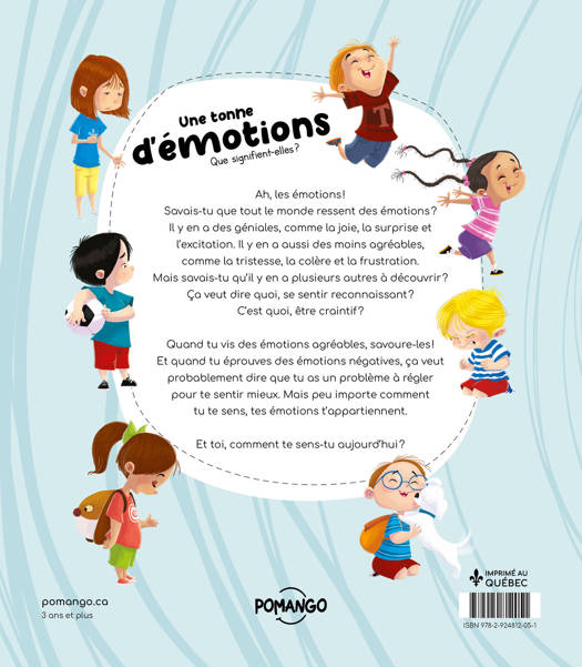 Ah, les émotions ! Savais-tu que tout le monde ressent des émotions ? Il y en a des géniales, comme la joie, la surprise et l'excitation. Il y en a aussi des moins agréables, comme la tristesse, la colère et la frustration. Mais savais-tu qu'il y en a plusieurs autres à découvrir ? Ça veut dire quoi se sentir reconnaissant ? C'est quoi être craintif ? Quand tu vis des émotions agréables, savoure-les ! Et quand tu éprouves des émotions négatives, ça veut probablement dire que tu as un problème à régler pour te sentir mieux. Mais peu importe comment tu te sens, tes émotions t'appartiennent. Et toi, comment te sens-tu aujourd'hui ?