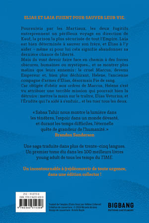 Poursuivis par les Martiaux, les deux fugitifs entreprennent un périlleux voyage en direction de Kauf, la prison la plus sécurisée de tout l'Empire. Car Laia est bien déterminée à sauver son frère, et Elias à l'y aider - même si pour lui cela signifie abandonner sa dernière chance de liberté.