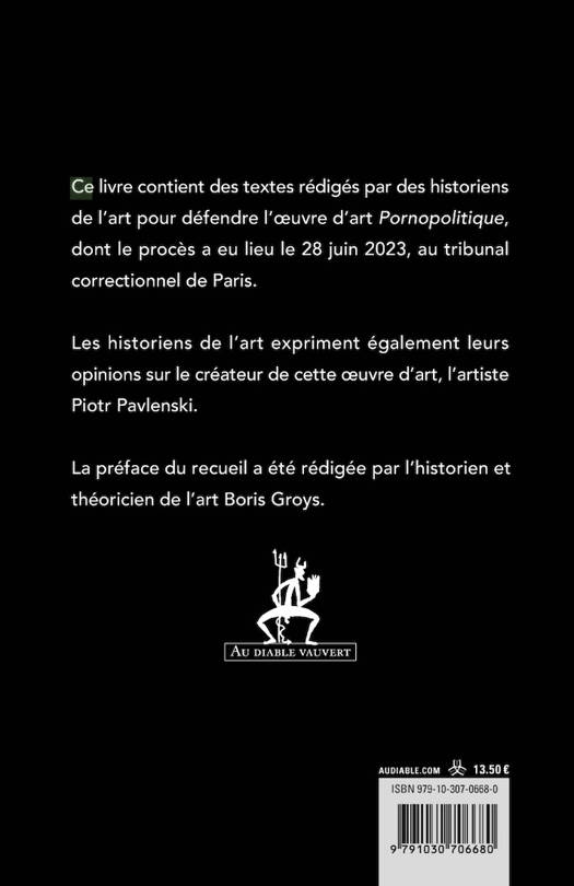 Ce livre contient des textes rédigés par des historiens de l’art pour défendre l’oeuvre d’art Pornopolitique, dont le procès a eu lieu le 28 juin 2023, au tribunal correctionnel de Paris.