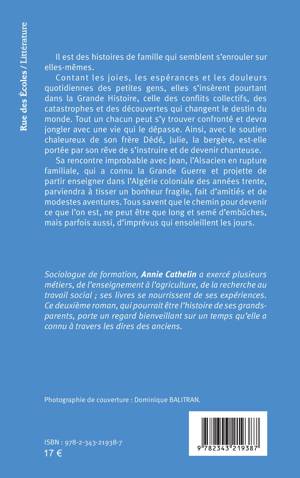 Il est des histoires de famille qui semblent s’enrouler sur elles-mêmes. Contant les joies, les espérances et les douleurs quotidiennes des petites gens, elles s’insèrent pourtant dans la Grande Histoire. Tout un chacun peut s’y trouver confronté et devra jongler avec une vie qui le dépasse. Ainsi, avec le soutien chaleureux de son frère Dédé, Julie, la bergère, est-elle portée par son rêve de s’instruire et de devenir chanteuse. Sa rencontre improbable avec Jean, l’Alsacien en rupture familiale, qui a connu la Grande Guerre et projette de partir enseigner dans l’Algérie coloniale des années trente, parviendra à tisser un bonheur fragile, fait d’amitiés et de modestes aventures. Tous savent que le chemin pour devenir ce que l’on est, ne peut être que long et semé d’embûches, mais parfois aussi, d’imprévus qui ensoleillent les jours.