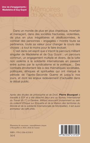 Dans un monde de plus en plus chaotique, incertain et menaçant, dans des sociétés fracturées, violentées, de plus en plus inégalitaires et désillusionnées, le combat des personnes engagées montre toute sa pertinence, toute sa valeur pour changer le cours des choses; à tout le moins pour le faire évoluer. C'est dans cet esprit que s'inscrit le parcours militant singulier de Madeleine et de Guy Guyot; un parcours commun, un engagement multiple et divers, de la lutte non violente à la solidarité internationale en passant entre autres par le syndicalisme et la politique... Des combats étroitement liés à des thématiques sociétales, politiques, éthiques et spirituelles qui ont marqué la période de l'après-Seconde Guerre et jusqu'à nos jours, et dont les enjeux redeviennent d'actualité dans le débat public.