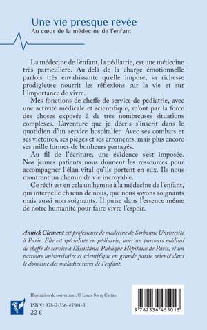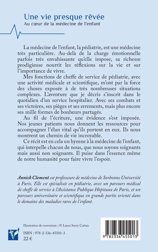 La médecine de l'enfant, la pédiatrie, est une médecine très particulière. Au-delà de la charge émotionnelle parfois très envahissante qu'elle impose, sa richesse prodigieuse nourrit les réflexions sur la vie et sur l'importance de vivre. Mes fonctions de cheffe de service de pédiatrie, avec une activité médicale et scientifique, m'ont par la force des choses exposée à de très nombreuses situations complexes. L'aventure que je décris s'inscrit dans le quotidien d'un service hospitalier. Avec ses combats et ses victoires, ses pièges et ses errements, mais plus encore ses mille formes de bonheurs partagés. Au fil de l'écriture, une évidence s'est imposée. Nos jeunes patients nous donnent les ressources pour accompagner l'élan vital qu'ils portent en eux. Ils nous montrent un chemin de vie incroyable. Ce récit est en cela un hymne à la médecine de l'enfant, qui interpelle chacun de nous, que nous soyons soignants mais aussi non soignants. Il puise dans l'essence même de notre humanité pour faire vivre l'espoir.