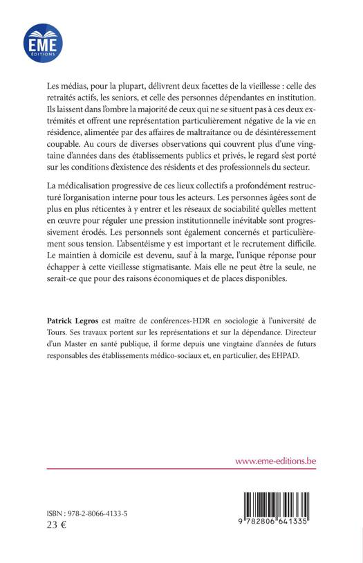 Les médias, pour la plupart, délivrent deux facettes de la vieillesse: celle des retraités actifs, les seniors, et celle des personnes dépendantes en institution. Ils laissent dans l'ombre la majorité de ceux qui ne se situent pas à ces deux extrémités et offrent une représentation particulièrement négative de la vie en résidence, alimentée par des affaires de maltraitance ou de désintéressement coupable. Au cours de diverses observations qui couvrent plus d'une vingtaine d'années dans des établissements publics et privés, le regard s'est porté sur les conditions d'existence des résidents et des professionnels du secteur.