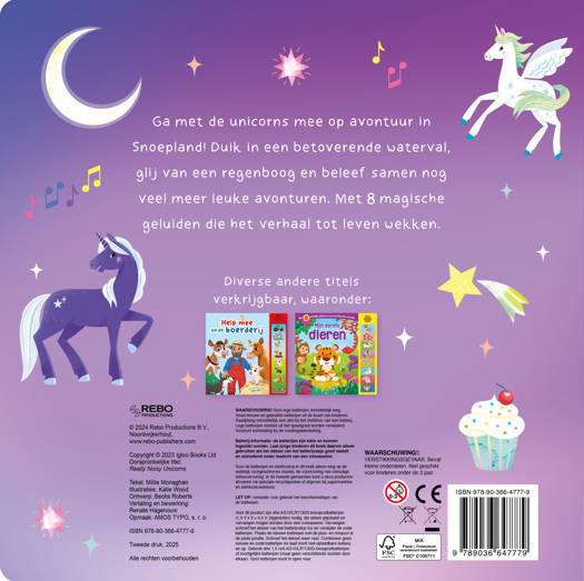 Ga met de unicorns mee op avontuur in Snoepland! Duik in een betoverende waterval, glij van een regenboog en beleef samen nog veel meer leuke avonturen. Met 8 magische geluiden die het verhaal tot leven wekken.