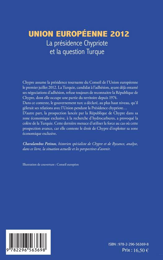 Le 1er juillet 2012, Chypre assumera la présidence tournante du Conseil de l'Union européenne, tandis que la Turquie, candidate à l'adhésion, refuse toujours de reconnaître cette République, menaçant même de geler ses relations avec l'Union pendant la présidence chypriote. La Turquie menace même d'utiliser la force contre Chypre, lui contestant le droit d'exploiter sa zone économique exclusive dans sa recherche d'hydrocarbures. Le livre dresse un clair état des lieux.