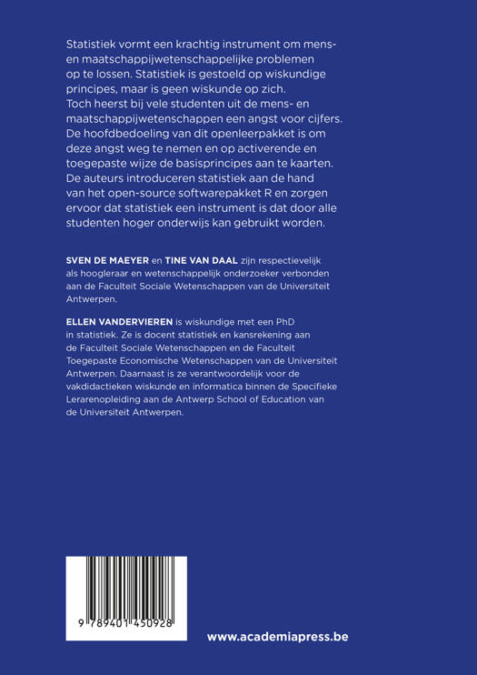 De auteurs introduceren statistiek aan de hand van het open-source softwarepakket R en zorgen ervoor dat statistiek een instrument is dat door alle studenten hoger onderwijs kan gebruikt worden.