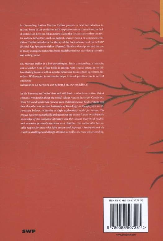 Martine Delfos presents a brief introduction in autism. Often it is difficult to understand autism. Some of the confusion with respect to autism comes from the lack of distinction between what autism is and circumstances that can foster autistic behaviour, such as neglect or severe trauma. Delfos introduces the theory of the Socioscheme and the MAS1P (Mental Age Spectrum within 1 Person). The clear description and the use of many examples make this book readable without losing scientific and solid ground. Dr. Martine Delfos is a bio-psychologist. She is a researcher, a therapist and a teacher. One of her fields is autism, with special attention to differentiating trauma within autistic behaviour from autism spectrum disorders. With respect to autism she helps developing autism care in several countries. Information on her work is to be found on: www.mdelfos.nl