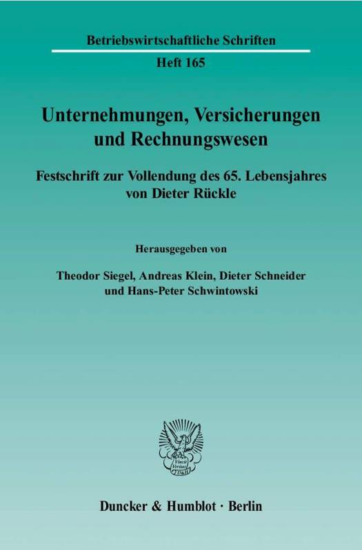 Bei Dieter Rückle spannt sich der Bogen u. a. von einem Grundlagenwerk der Steuerbilanzpolitik über Fragestellungen kapitalmarktorientierter Rechnungslegung und Abschlussprüfung bis zur ökonomischen Analyse der Beziehungen zwischen Versicherern und Versicherten, wobei er sich erfolgreich - in Kooperation mit Juristen - zugunsten angemessener und marktgerechter Schutzmechanismen für Versicherte einsetzt. Das breite Spektrum und die kritische Auseinandersetzung des Autors drücken auch die 28 Beiträge in der Festschrift aus. So werden im Teil A "Unternehmen, Unternehmenswert und Banken" u. a. aktuelle Probleme wie z. B. der Berliner Bankenskandal diskutiert. Im Teil B "Versicherung" wird die Interdisziplinarität von Dieter Rückle eindrucksvoll belegt, indem mehrheitlich juristische Autoren auf weitere offene Fragen im Versicherungsbereich eingehen. Teil C umfasst mit "Rechnungslegung" einen breiten Rahmen zwischen Norm-Fortentwickung und Einzelfragen wie zur Fair-Value-Bewertung und branchenspezifischen Sonderfragen. Im Teil D "Steuern" werden Fragen der Steuerwirkungen und -politik aufgeworfen, bevor sich der Kreis mit Teil E "Prüfung" u. a. zu Konsequenzen des Sarbanes-Oxley Act und zum Unabhängigkeitsproblem bei Wirtschaftsprüfern (und Hochschullehrern) schließt.