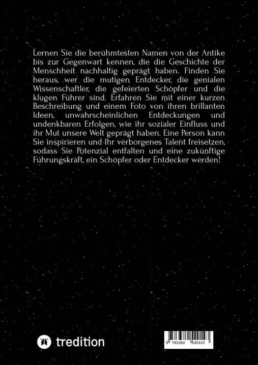 Lernen Sie die berühmtesten Namen von der Antike bis zur Gegenwart kennen, die die Geschichte der Menschheit nachhaltig geprägt haben. Finden Sie heraus, wer die mutigen Entdecker, die genialen Wissenschaftler, die gefeierten Schöpfer und die klugen Führer sind. Erfahren Sie mit einer kurzen Beschreibung und einem Foto von ihren brillanten Ideen, unwahrscheinlichen Entdeckungen und undenkbaren Erfolgen, wie ihr sozialer Einfluss und ihr Mut unsere Welt geprägt haben. Eine Person kann Sie inspirieren und Ihr verborgenes Talent freisetzen, sodass Sie Potenzial entfalten und eine zukünftige Führungskraft, ein Schöpfer oder Entdecker werden!