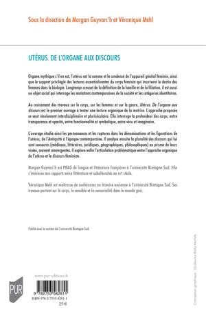 Au croisement des travaux sur le corps, sur les femmes et sur le genre, Utérus. De l'organe aux discours est le premier ouvrage à tenter une lecture organique de la matrice. L'approche proposée se veut résolument interdisciplinaire et pluriséculaire. Elle interroge la profondeur des corps, entre transparence et opacité, entre fonctionnalité et symbolique, entre vécu et imaginaire.