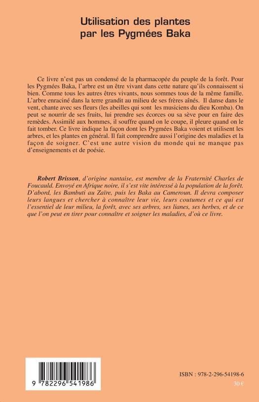 Pour les pygmées Baka, l'arbre est un être vivant dans cette nature qu'ils connaissent si bien. Ce livre indique la façon dont les Pygmées Baka voient et utilisent les arbres, et les plantes en général. Il fait comprendre aussi l'origine des maladies et la façon de soigner. C'est une autre vision du monde qui ne manque pas d'enseignements et de poésie.