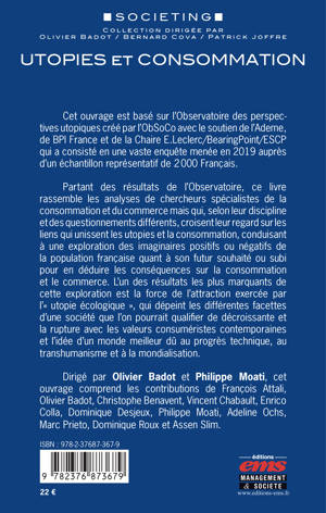 Cet ouvrage est basé sur l'Observatoire des perspectives utopiques créé par l'ObSoCo avec le soutien de l'Ademe, de BPI France et de la Chaire E.Leclerc/BearingPoint/ESCP qui a consisté en une vaste enquête menée en 2019 auprès d'un échantillon représentatif de 2 000 Français. Partant des résultats de l'Observatoire, ce livre rassemble les analyses de chercheurs spécialistes de la consommation et du commerce mais qui, selon leur discipline et des questionnements différents, croisent leur regard sur les liens qui unissent les utopies et la consommation, conduisant à une exploration des imaginaires positifs ou négatifs de la population française quant à son futur souhaité ou subi pour en déduire les conséquences sur la consommation et le commerce. L'un des résultats les plus marquants de cette exploration est la force de l'attraction exercée par l'« utopie écologique », qui dépeint les différentes facettes d'une société que l'on pourrait qualifier de décroissante et la rupture avec les valeurs consuméristes contemporaines et l'idée d'un monde meilleur dû au progrès technique, au transhumanisme et à la mondialisation. Dirigé par Olivier Badot et Philippe Moati, cet ouvrage comprend les contributions de François Attali, Olivier Badot, Christophe Benavent, Vincent Chabault, Enrico Colla, Dominique Desjeux, Philippe Moati, Adeline Ochs, Marc Prieto, Dominique Roux et Assen Slim.