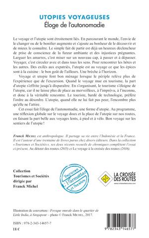 Le voyage et l'utopie sont étroitement liés. En parcourant le monde, l'envie de le bonifier s'ajoute au bonheur de le découvrir et de mieux le connaître. Quand le voyage mue en tourisme, la part d'utopie s'effrite jusqu'à disparaître. En s'organisant, le tourisme s'éloigne de l'utopie, car il ne laisse plus de place à l'imprévu, et donc à la véritable rencontre. Cet essai fait l'éloge de l'autonomadie. Cette réflexion sur le voyage doux et la place de l'utopie sur nos routes fait la part belle aux voyages lents, à pied et à vélo.