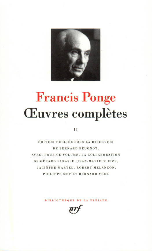 Ponge, ou la rage, dans ses proêmes, d'exprimer la chose, qui nous prend à partie pour "atteindre enfin par la parole au point dialectique où [la] situent sa forme et son milieu, sa condition muette et l'exercice de sa profession juste". Ponge, ou l'homme en chemin vers l'homme dans ce dire où l'objet montre "ce qu'il a de brut, de différent" au terme de l'investigation aimante du regard poétique, où se trouve conjuré le sort de l'"opiniâtrement clos". Ponge, c'est aussi, en marge des écoles, mais au coeur de l'histoire littéraire sans cesse revisitée, la quête du langage adéquat, quête incessante que souligne la genèse des textes. Les mots, le style doivent rendre compte du dessein humaniste du poète : être le héraut - plus que le chantre - de ce qui l'entoure et qu'artisan il détoure pour l'accoucher de son secret/projet - "une exacte compréhension du monde sans doute est à ce prix". "L'art de vivre d'abord y devait trouver son compte : il nous fallait relever ce défi." Le texte, jusqu'en sa matérialité, se veut pièce à conviction dans le réseau mouvant des recueils toujours recomposés, avec, en ligne de fuite, le rêve mallarméen du Livre.
