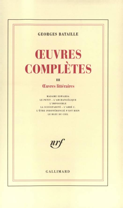 "Tous les récits et poèmes de Georges Bataille publiés de son vivant sont réunis ici, à une exception près : Histoire de l'oeil. C'était son premier livre et il était légitime qu'il figurât dans le premier tome de ces Œuvres complètes. Les oeuvres littéraires que l'on a groupées dans ce volume expriment la même exigence que les oeuvres théoriques de Bataille. Il s'agit là aussi d'une "expérience intérieure", une expérience de la vérité qui est d'abord ce cri : "Nous n'avons de possibilité que l'impossible." La poésie (L'Archangélique, L'Orestie, L'Être indifférencié) se veut "haine de la poésie", allant "au bout de la possibilité misérable des mots". Elle est le lieu où l'expérience se vit et se communique à la fois. Quant aux fictions, où "l'érotisme envisagé gravement, tragiquement, représente un singulier renversement", elles donnent de l'édifice "la clé lubrique". Ainsi Madame Edwarda et Le Petit mènent Dieu au bordel ; Histoire de rais et Dianus (ces deux récits qui, avec les poèmes de L'Orestie, composent L'Impossible, et dont La Scissiparité semble être un fragment avorté) lient lourdement les fièvres du désir aux fièvres de l'agonie ; L'Abbé C. met en scène un prêtre égaré par les débordements de son frère jumeau ; Le Bleu du ciel, enfin, est le plus beau roman d'amour, situé sous un ciel trop pur où déjà grondait l'orage des guerres." Thadée Klossowski.