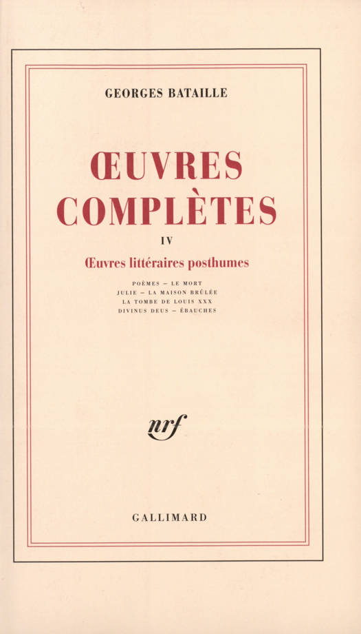 "Les manuscrits qu'ordonne ici une chronologie approximative (1942-1957) furent retrouvés après sa mort dans les dossiers de l'auteur. Il n'avait pu les publier ni même, pour la plupart, les achever : découragement, maladie, censure, contretemps... sont des raisons qu'on peut avancer ; restent ces reliefs. Les Poèmes rassemblent, à côté de strophes éliminées de l'oeuvre éditée, des vers érotiques, d'une crudité de boucherie ; Le Mort, scandaleux "chemin de croix", décrit le calvaire d'une femme que la mort de son amant précipite dans une nuit d'orageuse débauche ; La Tombe de Louis XXX, dont le titre et la composition renvoient au Petit, s'inscrit, sur le mode lubrique, parmi les récits de "l'expérience". Outre ces textes, dont il projeta la publication, Bataille avait conservé plusieurs brouillons abandonnés. Ainsi , Julie, ébauche d'un roman qui devait peut-être annexer Le Mort, un scénario de film, La Maison brûlée, et surtout Divinus Deus où, faisant suite à Madame Edwarda, Ma Mère et Charlotte d'Ingerville composent une sorte d'autobiographie de Pierre Angélique (pseudonyme utilisé pour Madame Edwarda). Divinus Deus se complète d'un récit inachevé, Sainte, qui apparaît comme une première version de Charlotte d'Ingerville, et de l'esquisse d'une postface, Paradoxe sur l'érotisme. Enfin, les Ébauches regroupent quantité de fragments, plans ou débuts de romans, de nouvelles, de pièces de théâtre..." Thadée Klossowski.