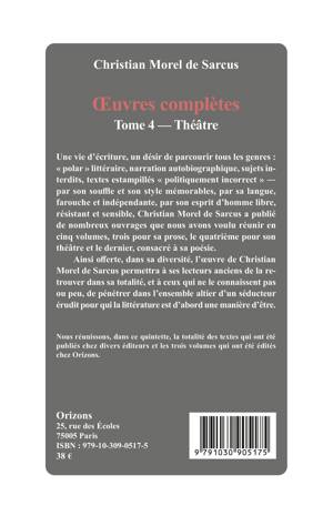 Une vie d’écriture, un désir de parcourir tous les genres : « polar » littéraire, narration autobiographique, sujets interdits, textes estampillés « politiquement incorrect » ― par son souffle et son style mémorables, par sa langue, farouche et indépendante, par son esprit d’homme libre, résistant et sensible, Christian Morel de Sarcus a publié de nombreux ouvrages que nous avons voulu réunir en quatre volumes, trois pour sa prose, le dernier consacré à son théâtre et à sa poésie. Ainsi offerte, dans sa diversité, l’œuvre de Christian Morel de Sarcus permettra à ses lecteurs anciens de la retrouver dans sa totalité, et à ceux qui ne le connaissent pas ou peu, de pénétrer dans l’ensemble altier d’un séducteur érudit pour qui la littérature est d’abord une manière d’être.