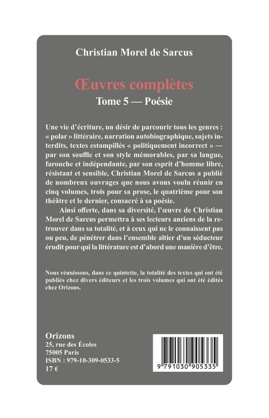 Une vie d’écriture, un désir de parcourir tous les genres : « polar » littéraire, narration autobiographique, sujets interdits, textes estampillés « politiquement incorrect » ― par son souffle et son style mémorables, par sa langue, farouche et indépendante, par son esprit d’homme libre, résistant et sensible, Christian Morel de Sarcus a publié de nombreux ouvrages que nous avons voulu réunir en cinq volumes, trois pour sa prose, le quatrième pour son théâtre et le dernier, consacré à sa poésie. Ainsi offerte, dans sa diversité, l’œuvre de Christian Morel de Sarcus permettra à ses lecteurs anciens de la retrouver dans sa totalité, et à ceux qui ne le connaissent pas ou peu, de pénétrer dans l’ensemble altier d’un séducteur érudit pour qui la littérature est d’abord une manière d’être. Nous réunissons, dans ce quintette, la totalité des textes qui ont été publiés chez divers éditeurs et les trois volumes qui ont été édités chez Orizons.