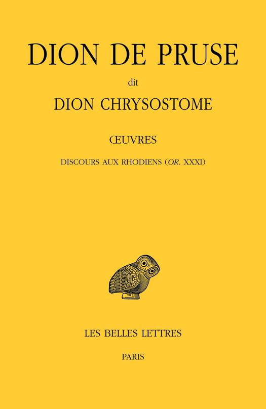 Généralement daté du début du principat de Vespasien, c’est-à-dire dans la période qui précéda l’exil de Dion, le discours XXXI Aux Rhodiens se présente comme le premier d’une série de discours aux villes (respectivement Rhodes, Alexandrie, Tarse, Célènes-Apamée de Phrygie et Corinthe). L’ensemble de ces discours, prononcés devant des assemblées de citoyens, est resté groupé dans la tradition manuscrite ultérieure, signe que leur parenté de genre et de thème a été communément perçue. Des discours aux villes proprement dits (Orr. xxxi à xxxvii), le premier de la série, le Rhodien, est le plus long et sans doute le plus représentatif. Sous l’apparence d’une oeuvre d’apparat, il ne s’inscrit pas moins dans la vie politique de la cité d’accueil, puisqu’il dénonce devant une assemblée municipale le déplorable usage du remploi des statues honorifiques. Les Rhodiens avaient en effet l'habitude de remployer certaines des statues de la ville afin d’honorer de nouveaux bénéficiaires – pratique en fait usuelle, à l’époque, dans tout le monde grec et latin.