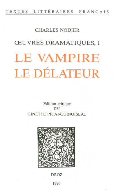 Jusqu'en 1828, Nodier s'est consacré au théâtre ; de cette activité seuls cinq drames ou mélodrames nous sont parvenus. Le Vampire est adapté de Byron, et Le Délateur d'une pièce italienne de Camillo Frederici. Mme Picat-Guinoiseau, grâce à l'étude des manuscrits, a pu relever des coupures de la censure, et illustrer son édition de gravures représentant les décors des représentations parisiennes. En outre, elle a relevé les interventions de la musique et de la mise en scène.