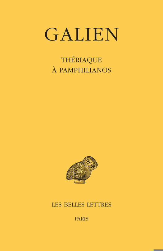 Medicament fetiche des empereurs romains, la theriaque, precieux antidote compose de tres nombreux et couteux ingredients dont l'opium et la chair de vipere, etait reputee efficace contre les venins et les poisons et supposee guerir toutes les maladies. Sa preparation complexe a donne lieu a une importante litterature ou les medecins grecs rivalisent de science et d'habilete pour adapter la fameuse recette mise au point par Andromaque, medecin de Neron. A cote du traite sur les Antidotes ou le grand medecin Galien de Pergame expose comment il obtint la charge de preparateur imperial de la theriaque sous Marc Aurele, le corpus galenique nous a conserve deux traites apocryphes consacres au celebre electuaire: apres la Theriaque a Pison parue dans la CUF en 2016, le petit traite sur la Theriaque a Pamphilianos vient donc completer cet ensemble consacre a cette preparation emblematique de la pharmacologie antique et dont la recette, transmise d'occident en orient et jusqu'en Chine, a continue d'etre preparee dans les officines jusqu'a la fin du XIXe siecle.