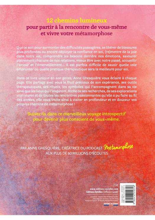 Dans ce livre unique en son genre, Anne Ghesquière vous éclaire à chaque page. Elle partage avec vous le fruit précieux de son expérience, ses outils thérapeutiques, ses rituels, les symboles qui l’accompagnent dans sa vie ainsi que les lieux qui l’inspirent. Riche de ses recherches, de ses explorations intérieures et de toutes les rencontres passionnantes qu’elle a pu faire au fil des années, elle vous invite ainsi à visiter en profondeur et en douceur vos propres chemins de métamorphose !