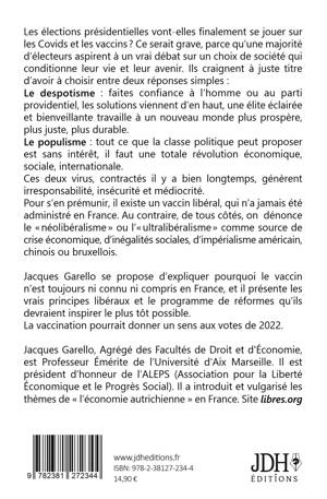 Les élections présidentielles vont-elles finalement se jouer sur les Covids et les vaccins ? Ce serait grave, parce qu'une majorité d'électeurs aspirent à un vrai débat sur un choix de société qui conditionne leur vie et leur avenir. Ils craignent à juste titre d'avoir à choisir entre deux réponses simples : Le despotisme : faites confiance à l'homme ou au parti providentiel, les solutions viennent d'en haut, une élite éclairée et bienveillante travaille à un nouveau monde plus prospère, plus juste, plus durable. Le populisme : tout ce que la classe politique peut proposer est sans intérêt, il faut une totale révolution économique, sociale, internationale. Ces deux virus, contractés il y a bien longtemps, génèrent irresponsabilité, insécurité et médiocrité. Pour s'en prémunir, il existe un vaccin libéral, qui n'a jamais été administré en France. Au contraire, de tous côtés, on dénonce le « néolibéralisme » ou l'« ultralibéralisme » comme source de crise économique, d'inégalités sociales, d'impérialisme américain, chinois ou bruxellois. Jacques Garello se propose d'expliquer pourquoi le vaccin n'est toujours ni connu ni compris en France, et il présente les vrais principes libéraux et le programme de réformes qu'ils devraient inspirer le plus tôt possible. La vaccination pourrait donner un sens aux votes de 2022. Jacques Garello, Agrégé des Facultés de Droit et d'Économie, est Professeur Émérite de l'Université d'Aix Marseille. Il est président d'honneur de l'ALEPS (Association pour la Liberté Économique et le Progrès Social). Il a introduit et vulgarisé les thèmes de « l'économie autrichienne » en France. Site libres.org
