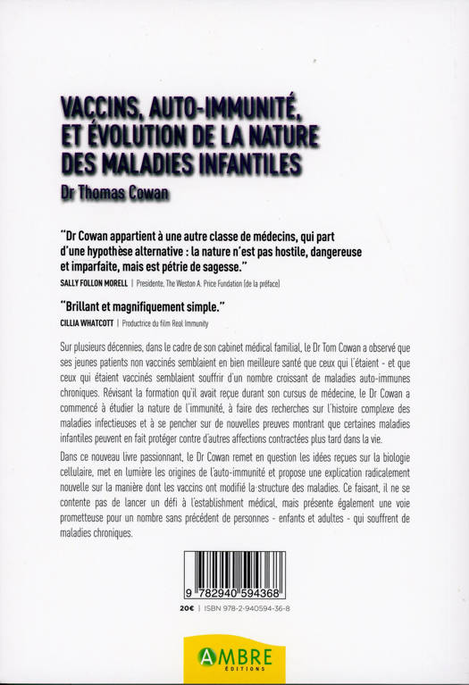 Sur plusieurs décennies, dans le cadre de son cabinet médical familial, le Docteur Tom Cowan a observé que ses jeunes patients non vaccinés semblaient en bien meilleure santé que ceux qui l'étaient et que ceux qui étaient vaccinés semblaient souffrir d'un nombre croissant de maladies auto-immunes chroniques. Révisant la formation qu'il avait reçue durant son cursus de médecine, le Docteur Cowan a commencé à étudier la nature de l'immunité, à faire des recherches sur l'histoire complexe des maladies infectieuses et à se pencher sur de nouvelles preuves montrant que certaines maladies infantiles peuvent en fait protéger contre d'autres affections contractées plus tard dans la vie. Dans ce nouveau livre passionnant, le Docteur Cowan remet en question les idées reçues sur la biologie cellulaire, met en lumière les origines de l'auto-immunité et propose une explication radicalement nouvelle sur la manière dont les vaccins ont modifié la structure des maladies. Ce faisant, il ne se contente pas de lancer un défi à l'establishment médical, mais présente également une voie prometteuse pour un nombre sans précédent de personnes – enfants et adultes - qui souffrent de maladies chroniques.