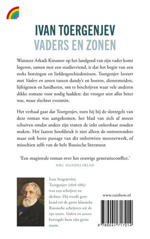 Wanneer Arkadi Kirsanov op het landgoed van zijn vader komt logeren, samen met een studievriend, is dat het begin van een reeks botsingen en liefdesgeschiedenissen. Toergenjev laveert met Vaders en zonen tussen dandy's en boeren, dienstmeiden, lijfeigenen en landheren, om te beschrijven waar vele anderen dikke romans voor nodig hadden: dat vroeger niet alles beter was, maar slechter evenmin. Het verhaal gaat dat Toergenjev, toen hij bij de slotregels van Vaders en zonen was aangekomen, het blad van zich af moest schuiven omdat anders zijn tranen de inkt onleesbaar zouden maken. Het laatste hoofdstuk is niet alleen de ontroerendste maar ook beste passage van dit onbetwiste meesterwerk, of misschien zelfs van de hele Russische literatuur.